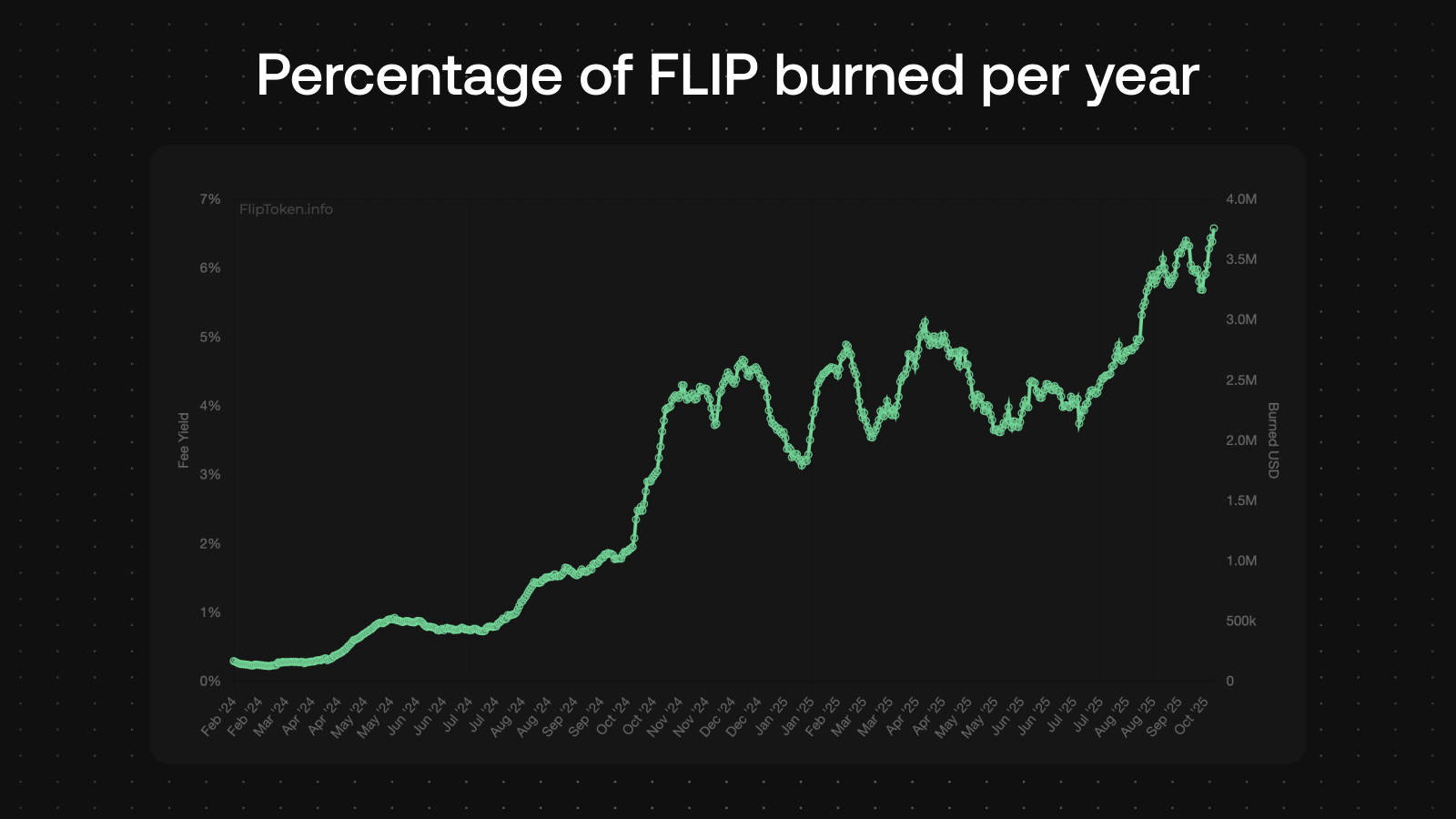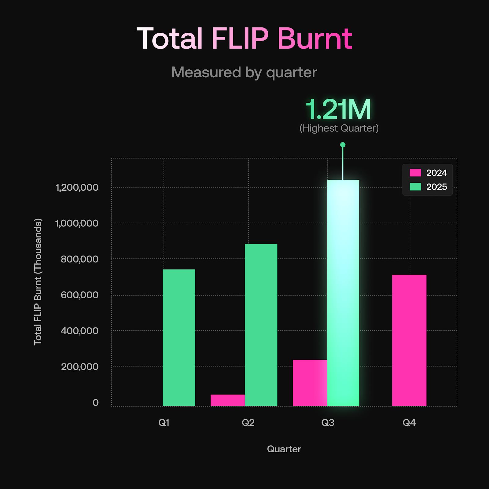 At current market prices of $0.60 per FLIP, this equates to approximately $720,000 in value removed from supply during the quarter. Based on current burn rates, the protocol’s mechanisms are on track to remove the equivalent of 6.58% of total supply annually, driven entirely by organic network usage and product participation, with no monetary incentive-driven campaigns or inflated metrics.