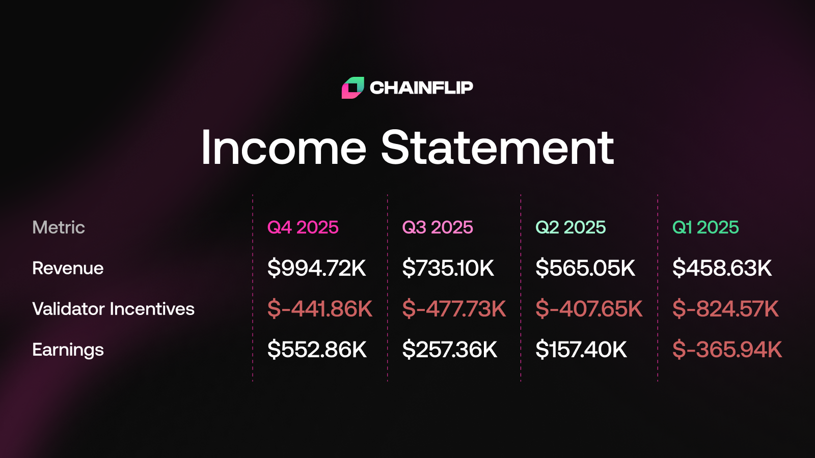 Beyond topline volume and fee growth, Q4 2025 also marked a meaningful shift in Chainflip’s financial profile.