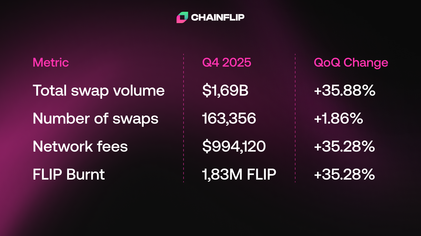 Q4 2025 was a breakout quarter for Chainflip. The protocol delivered record swap volumes, network fee generation, and FLIP burn, while simultaneously launching major product capabilities that extend Chainflip beyond swaps into native lending and capital efficiency products.